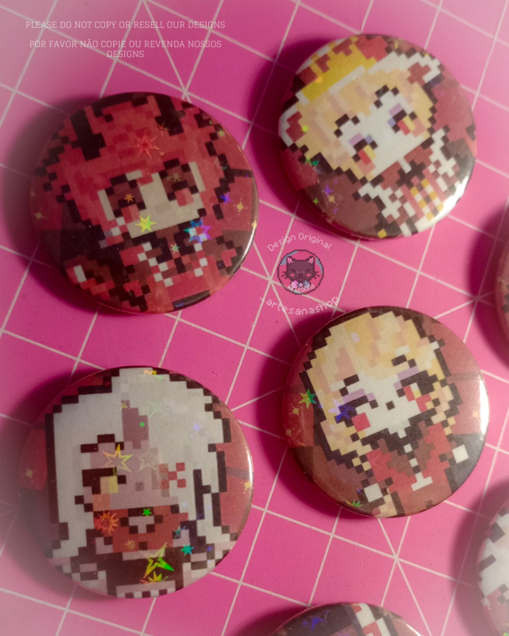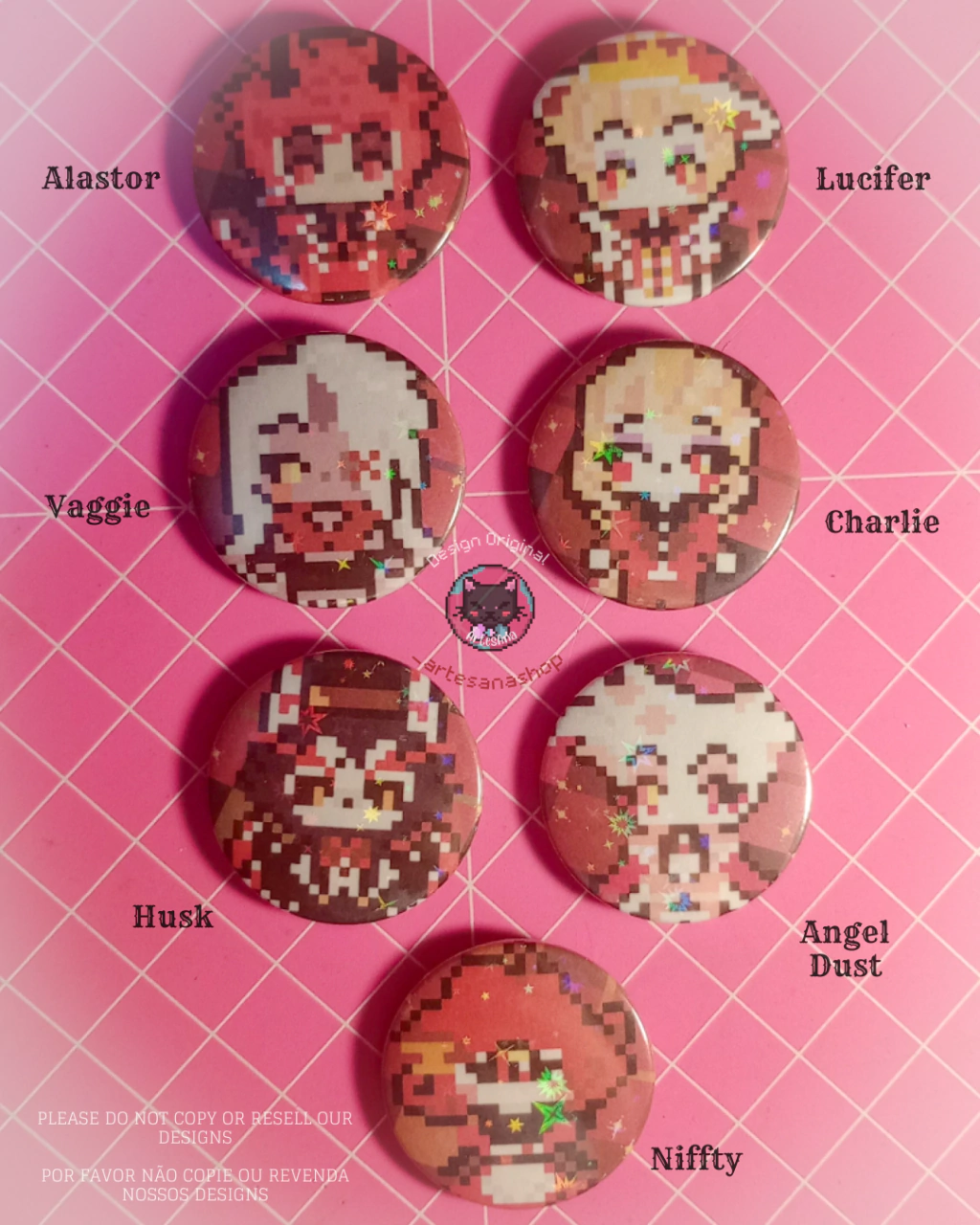 Buttons 3.8cm com nosso design original de pixel art inspirado nos personagens de Hazbin Hotel.