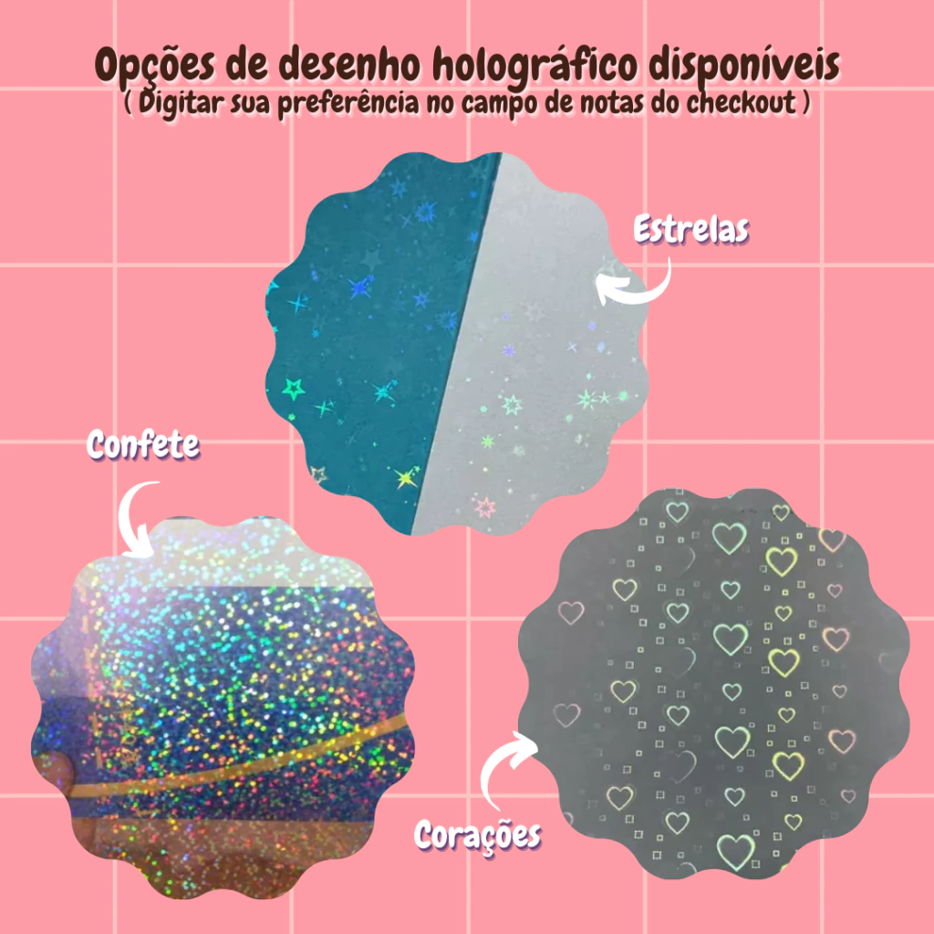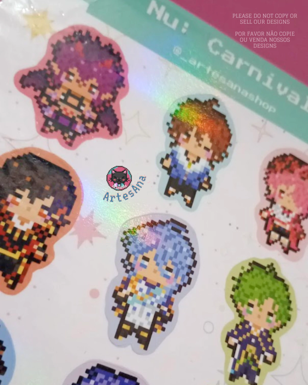 Cartela de mini adesivos holográficos inspirados nos personagens de Nu:Carnival com pixel art desenhada por nós.