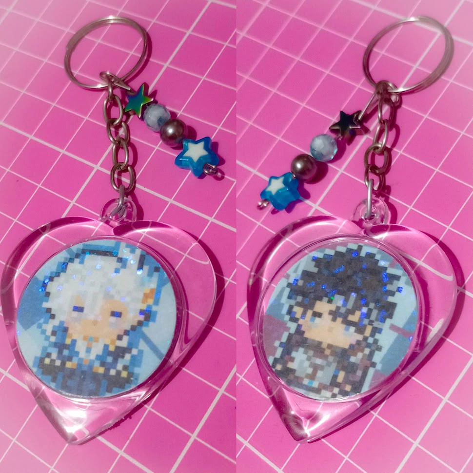 Chaveiros de acrílico em formato de coração com designs originais de pixel art inspirados nos personagens de Genshin Impact. Acompanham um pingente decorativo de miçangas.