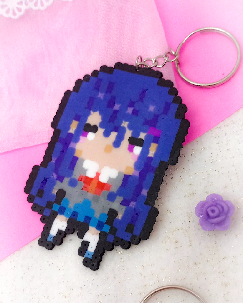 Chaveiros feitos de perler beads 2,6mm inspirados nas personagens Monika, Sayori, Yuri e Natsuki em nosso estilo pixel art Hana.