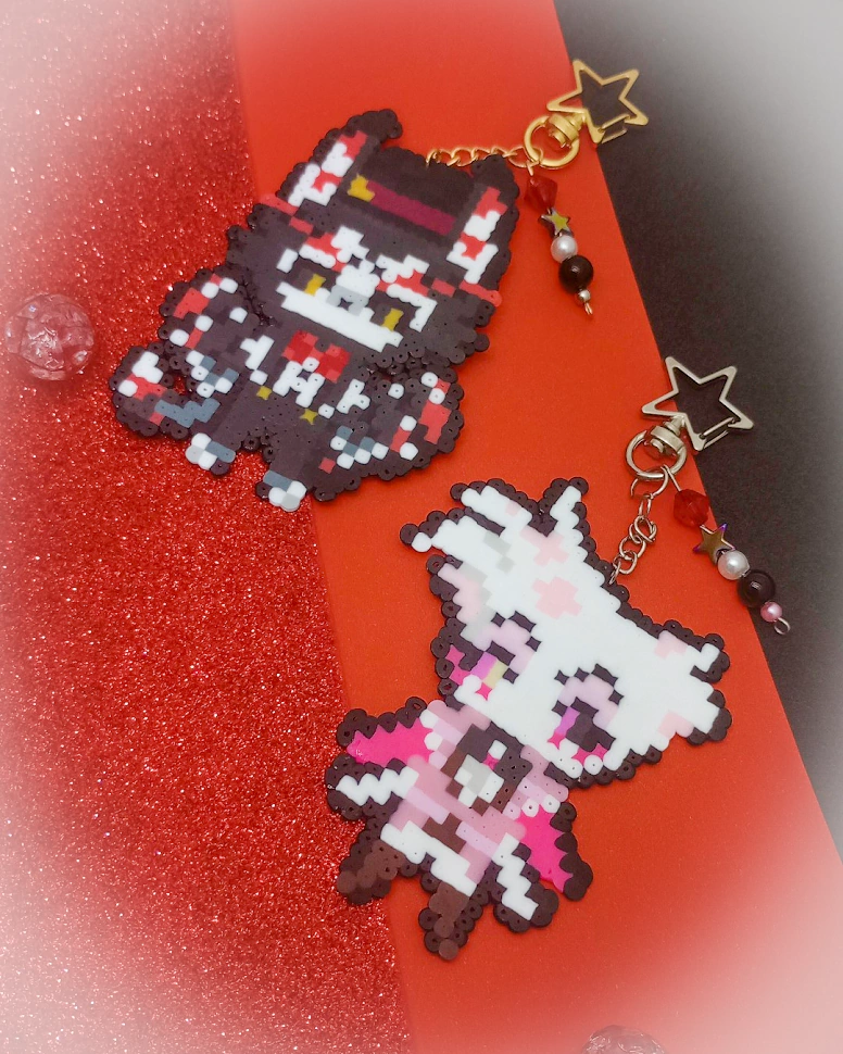 Chaveiro com pixel art na coleção Hana desenhada por nós, inspirado nas personagens de Hazbin Hotel, feito de perler beads 2,6mm, sob encomenda.