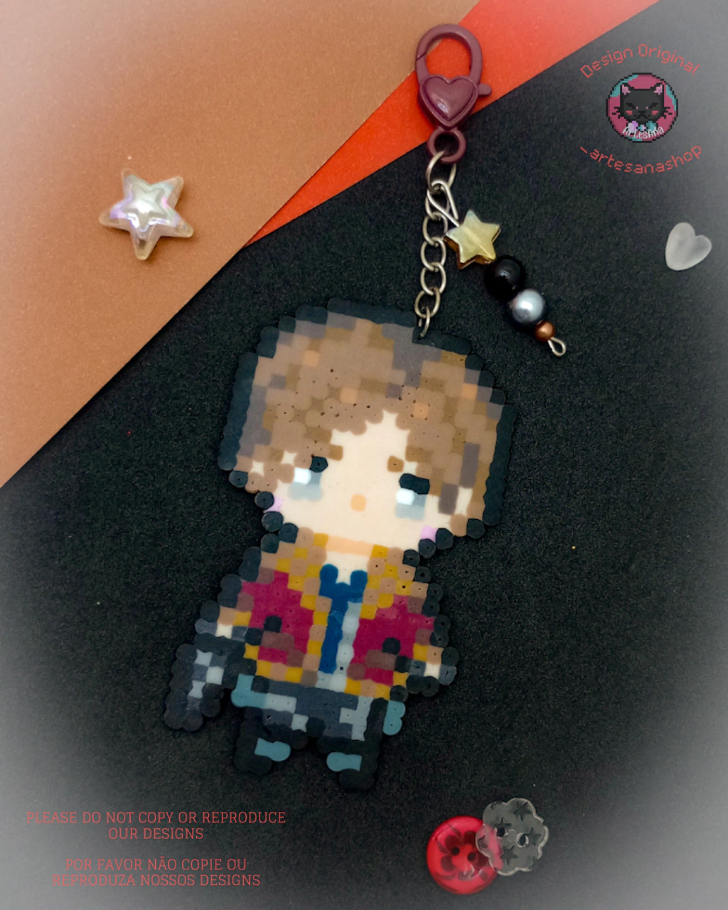 -Chaveiro Star ou Heart: Acompanha a peça de perler beads em uma argola com formato de estrela ou coração colorido, assim como um pingente extra com miçangas que é personalizado de acordo com o personagem.
