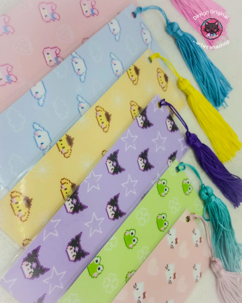 Marca-páginas plastificados, com pixel art inspirada nos rostos de personagens da Sanrio, feitos sob encomenda.