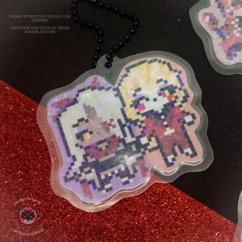 Pingentes impressos , plastificados com calor e holográficos, inspirado nos personagens de Hazbin Hotel, de mãos dadas, com arte em nosso estilo pixel art Hana. Em um lado do pingente eles estão de olho aberto, e do outro piscando.