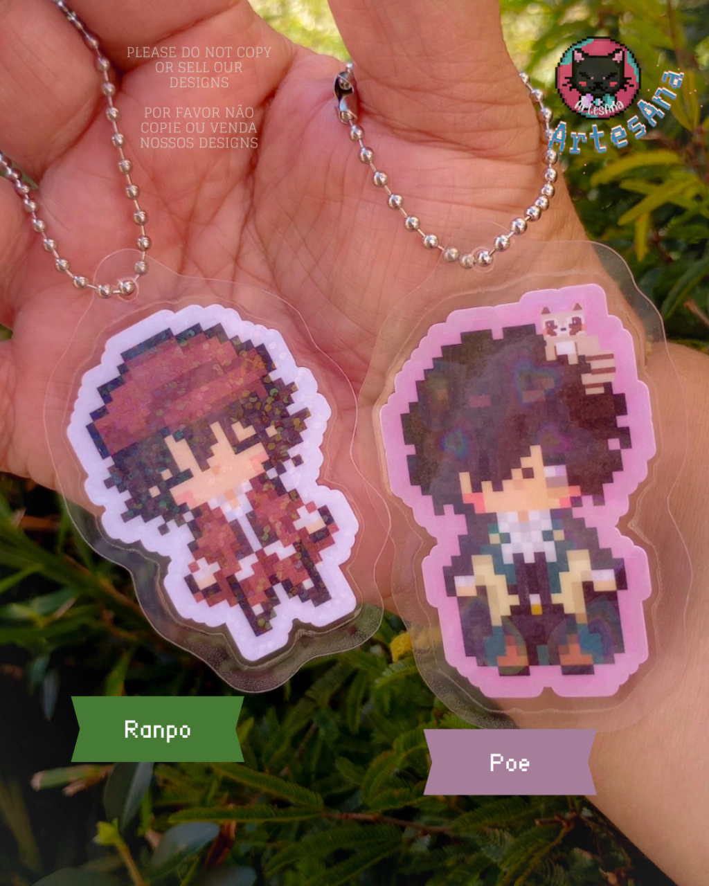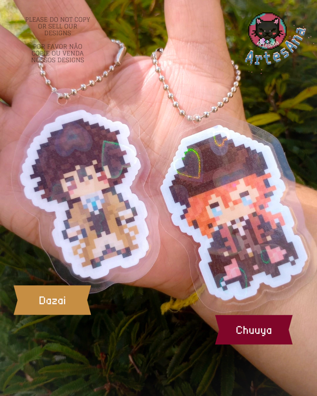 Pingentes impressos, holográficos e plastificados com calor inspirado nos personagens de Bungou Stray Dogs, com arte em nosso estilo pixel art Hana. Ambos os lados dos pingentes solo tem a mesma imagem, pingentes de casal tem imagens diferentes no verso.