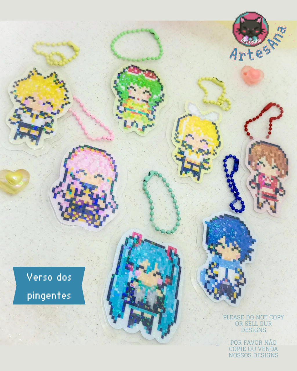 Pingentes impressos , plastificados com calor e holográficos, inspirado nos personagens de Vocaloid com arte em nosso estilo pixel art Hana. Em um lado do pingente eles estão de olho aberto, e do outro piscando.